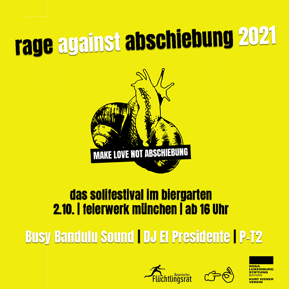 Das rage against abschiebung ist das größte regelmäßig stattfindende antirassistische Festival im süddeutschen Raum, veranstaltet vom Bayerischen Flüchtlingsrat. Dieses Jahr findet es endlich wieder zum gewohnten Datum im Feierwerk statt! Am 2.10. werden wir ab 16 Uhr den Biergarten des Feierwerks mit grandiosen DJ*anes bespielen. Mit am Start sind Busy Bandulu Sound, DJ El Presidente und PT-2.